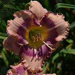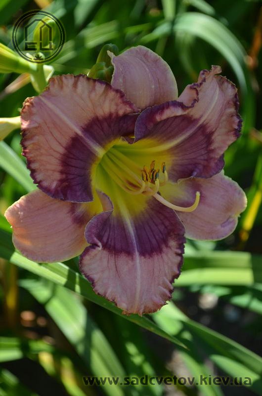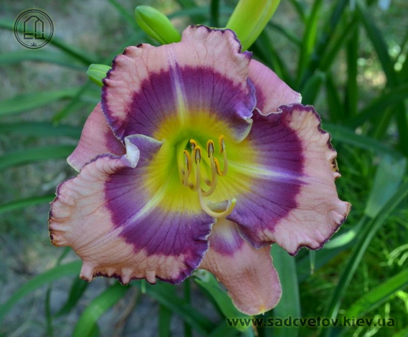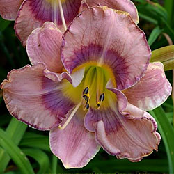 Світло-рожевий з великим лілово-лавандовим оком окресленим в розтяжку бордовою облямівкою і такою ж облямівкою по гофрованому краю пелюсток, зелено-жовте горло.