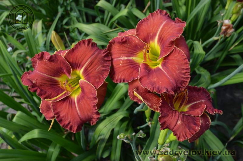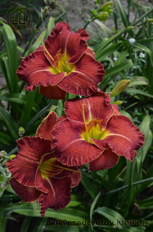 Гофрований оксамитовий вишнево-червоний з тонкою жовтою окантовкою, вишневим оком розсіченим білими осьовими променями і зелено-жовтим горлом.