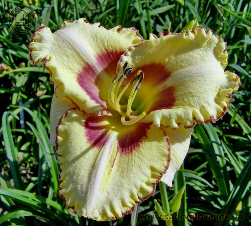 Молочно-кремовий з сливово-фіолетовим оком і такою ж тонкою каймою по гофрованому краю пелюстки.