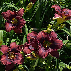 Темний вишневий з чорно-вишневим оком і такою ж гофрованою тонкою каймою, горло - від оранжевого через жовтий до лимонно-зеленого.