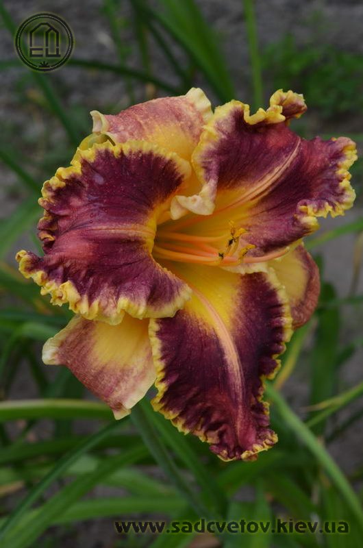 Гофрований червоно-коричневий з темно-вишневим оком, лимонним горлом, ярко вираженою двоколірною (око, горло) облямівкою і світлими помаранчевими променями по середині пелюстки.