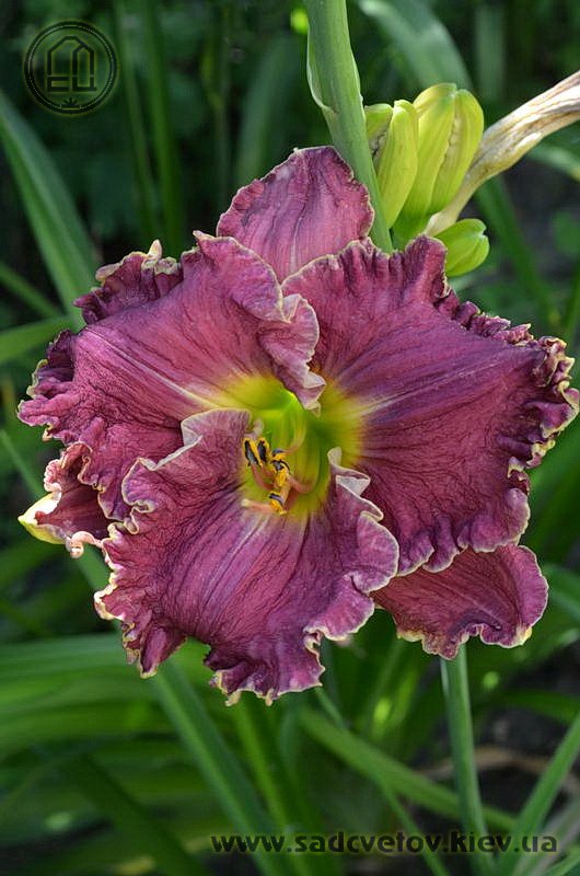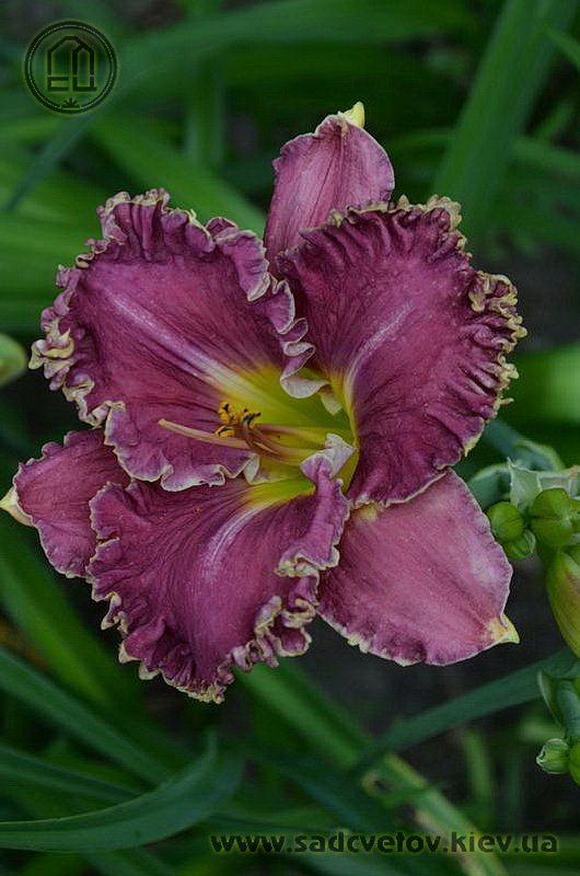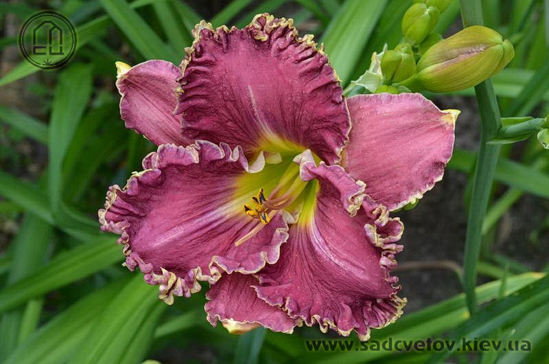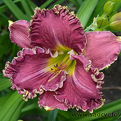 Супергофрований насичений малиново-рожевий із золотистою облямівкою по краю, поздовжніми світлими смужками по пелюстках, лимонно-зеленим горлом.