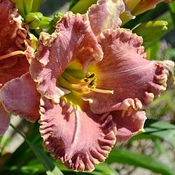 Незвичайний муаровий рожевий з золотистими і сріблястими вкрапленнями з широко гофрованим краєм, лимонно-зелене горло.