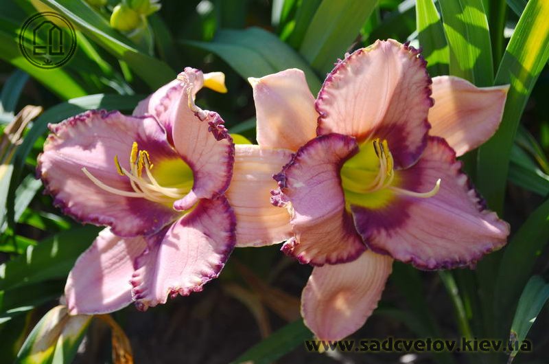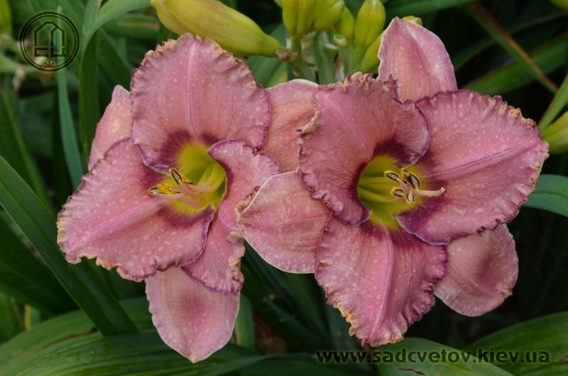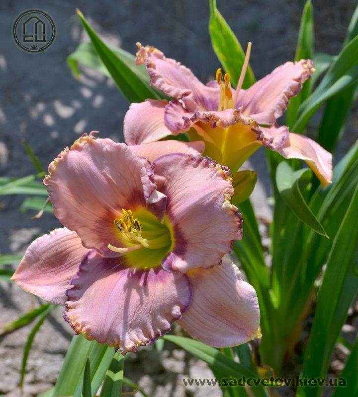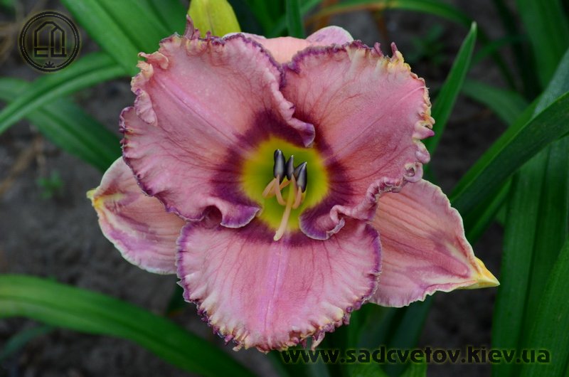 Рожевий з фіолетово-малиновим оком і облямівкою по гофрованому з золотистими мереживами краю, лимонно-зелене горло.