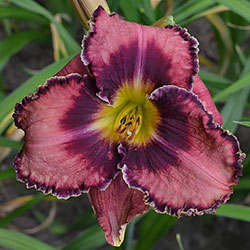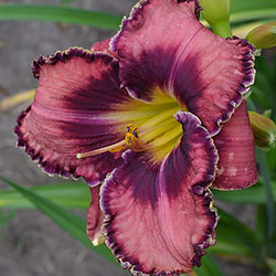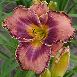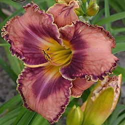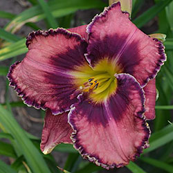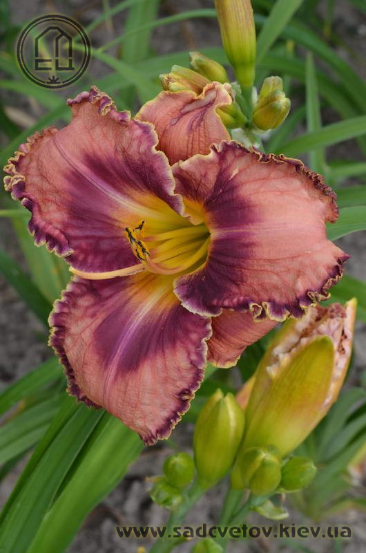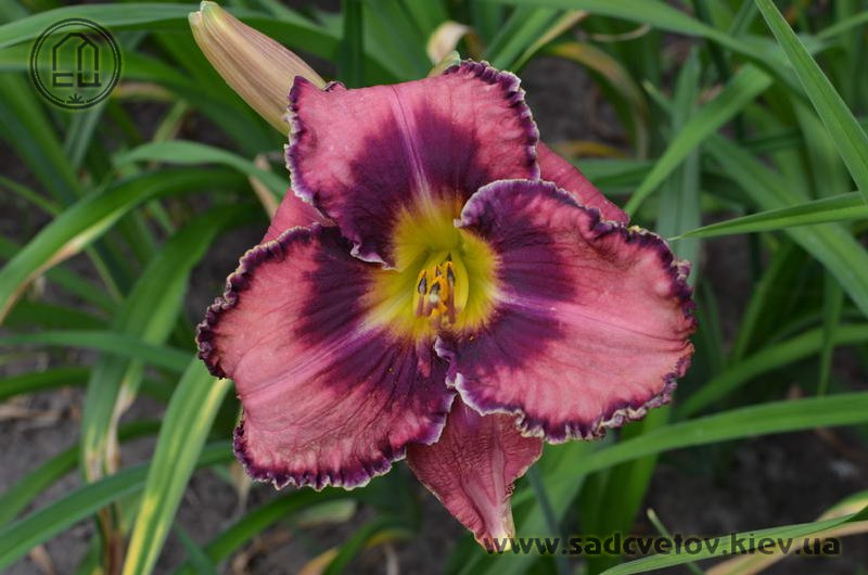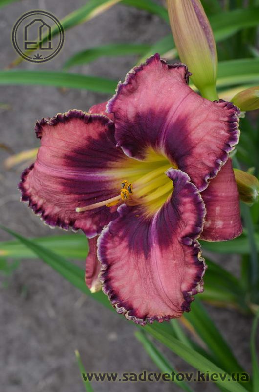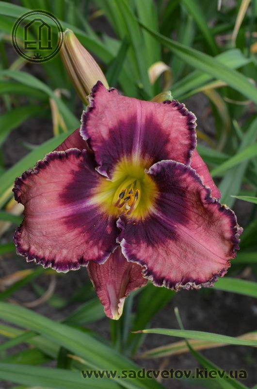 Рожевий з сливово-бордовим оком, лимонним горлом і двокольоровою акуратною облямівкою кольору ока в поєднанні з білою окантовкою по торцях.