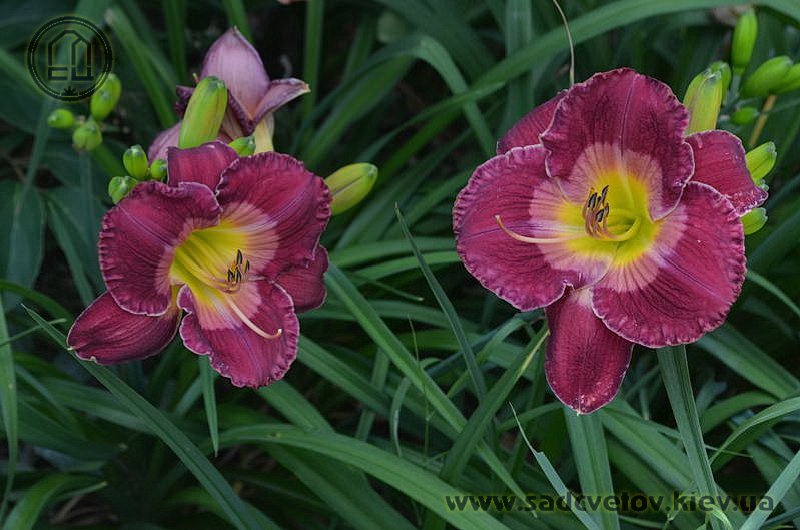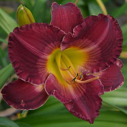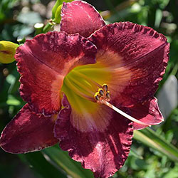 Гофрований насичений малиновий зі світлим рожевим оком навколо лимонно-зеленуватого горлечка.