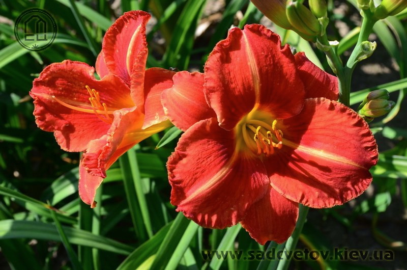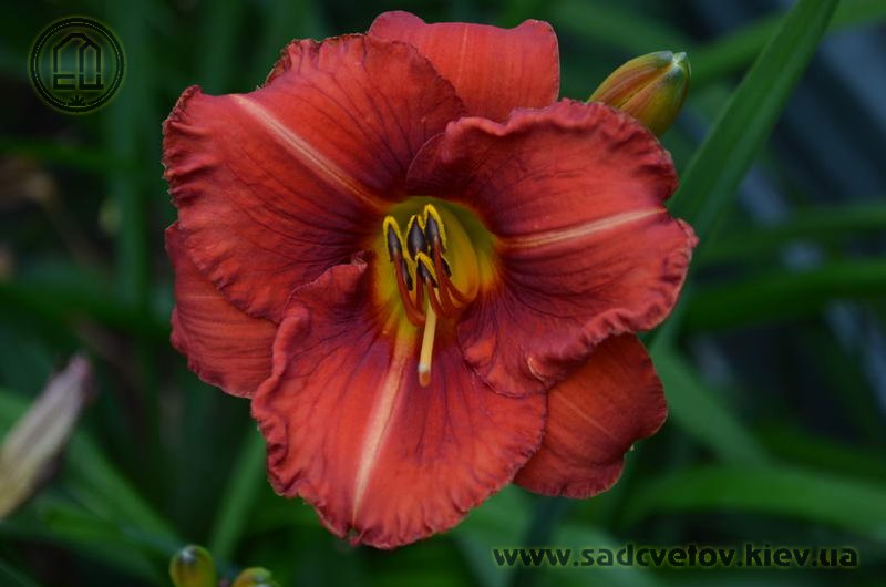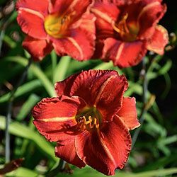 Червоний гофрований з лимонно-зеленим горлом, і радіальними жовтими смужками уздовж пелюсток.