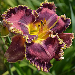 Приголомшлива супергофрована драматична квітка, насичена карміново-червона з великим темним бордово-фіолетовим оком і такою ж широко забарвленою сильно гофрованою облямівкою із золотими мереживами в торці, жовто-лимонне горло.