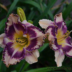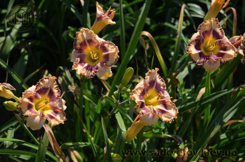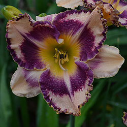 Гофрований кремовий з темним чорнильно-сливовим оком в поєднанні з такою ж широкою облямівкою, жовто-лимонне горло і світлий лимонний торець гофрованих пелюсток.