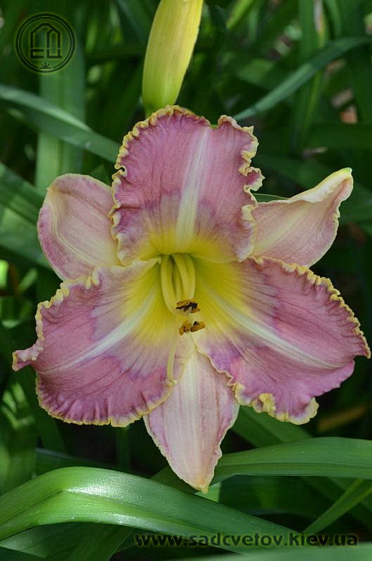 Гофрований ніжний блідо-рожевий з великим перламутровим оком окресленим насиченням фонового кольору, жовта тонка облямівка по краю, жовте горло.