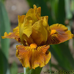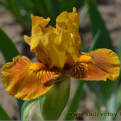 Акуратний з круглими широкими фолами. Ст. - зелено-жовті, ф. - жовто-коричневі з тонкою розмитою гірчичною облямівкою і таким же смугастим візерунком навколо бороди і в плечах. Б. - яскраві жовті, більш гарячі до горловини.