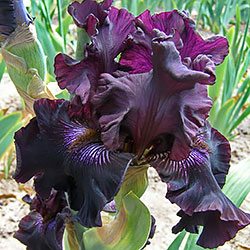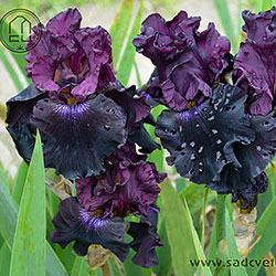 Сильний гофрований вишнево-чорний красень. Ф. темніші з невеликим біло-фіолетовим малюнком у червоно-вохристих б.