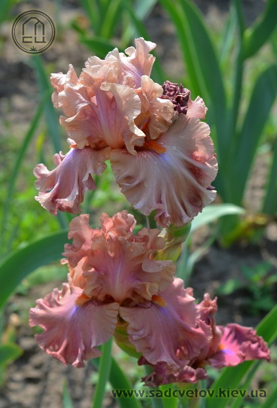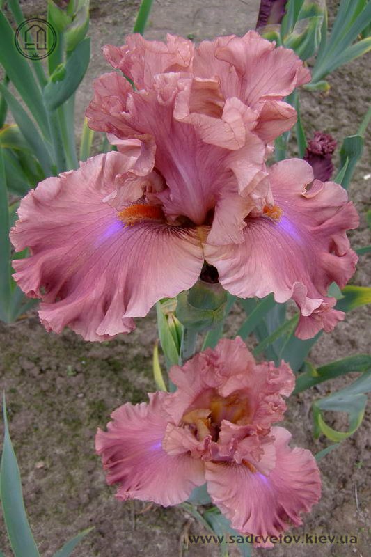 Великий супергофрований, злегка мереживний. Широкі малиново-теракотові квіти з маленьким фіолетовим полум'ям на ф. нижче яскравих мандаринових б..