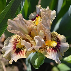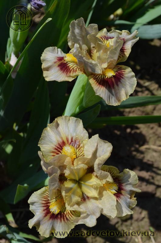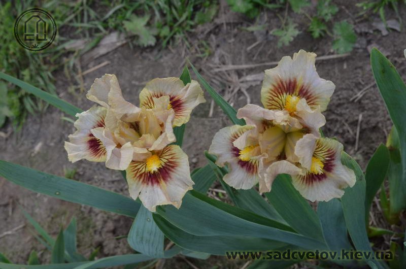 Гофрована квітка. Ст. - дуже світлий зеленувато-лавандовий з помітними темними прожилками, серединка як стандарти з зеленувато-жовтими включеннями, ф. - як стандарти з темною коричнево-бордовою плямою навколо бороди, яка розріджується на прожилки в жовтуватих плечах. Б. - яскравий жовтий з білим в основі, більш вираженим на кінчику.