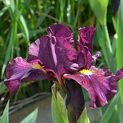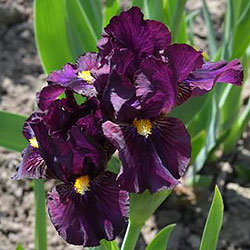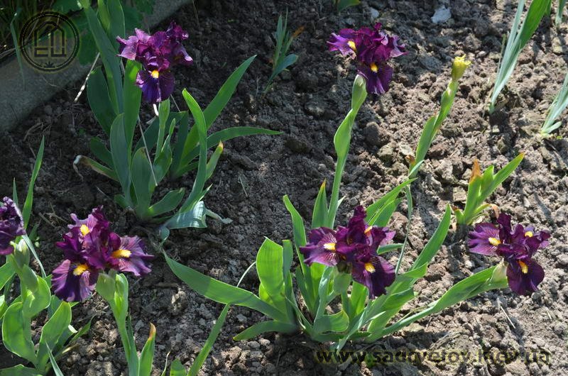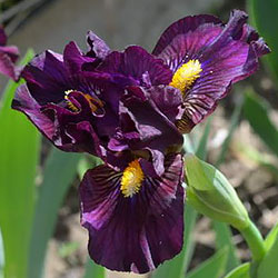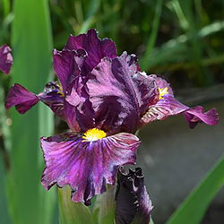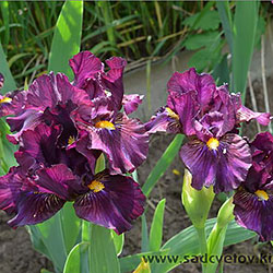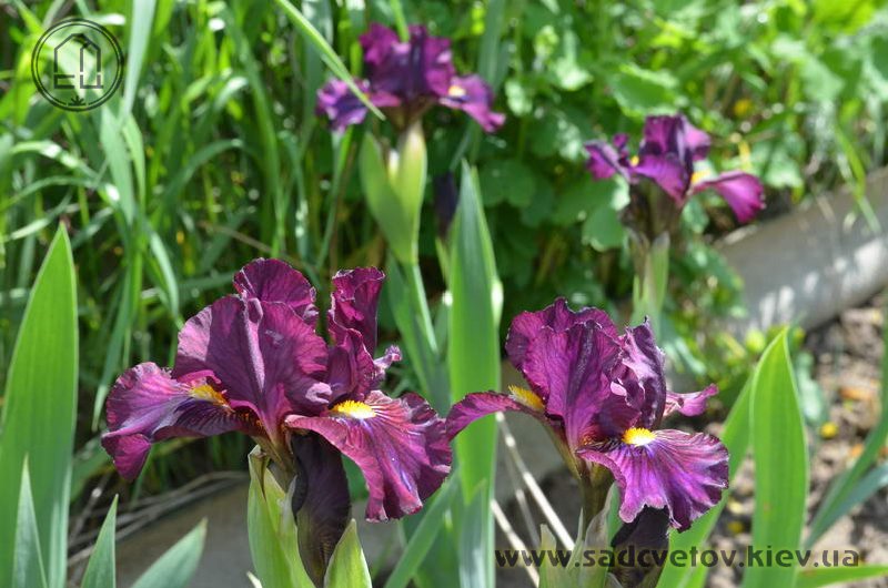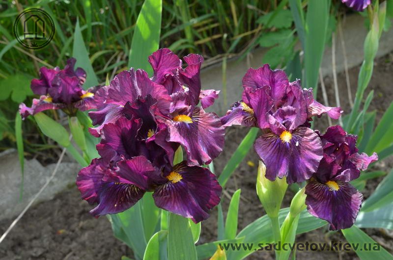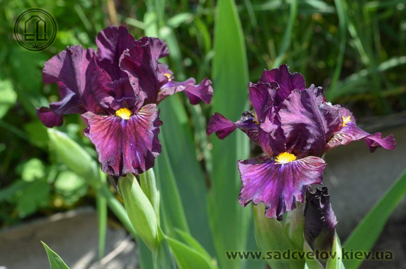 Темно-фіолетова гофрована квітка з золотистими включеннями в серединці, ф. з вишневими боками і смугастим візерунком білих, жовтих і фіолетових прожилок біля жовтої з білою основою б.