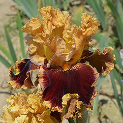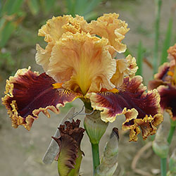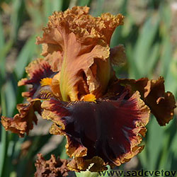 Супергофрована, мереживна квітка. Ст. - Світлого золотисто-коричневого кольору з зелено-жовтим стрижнем в срежніх жилках. Серединка мереживна з золотисто-жовтими кінчиками. Ф. - темні бордові, більш червоні з боків з широкою 1/4" світлою золотисто коричневою облямівкою по краю і невеликою люмінатою білих прожилок від бороди і жовтих в плечах. Б. - оранжеві з більш жовтим кінцем.