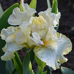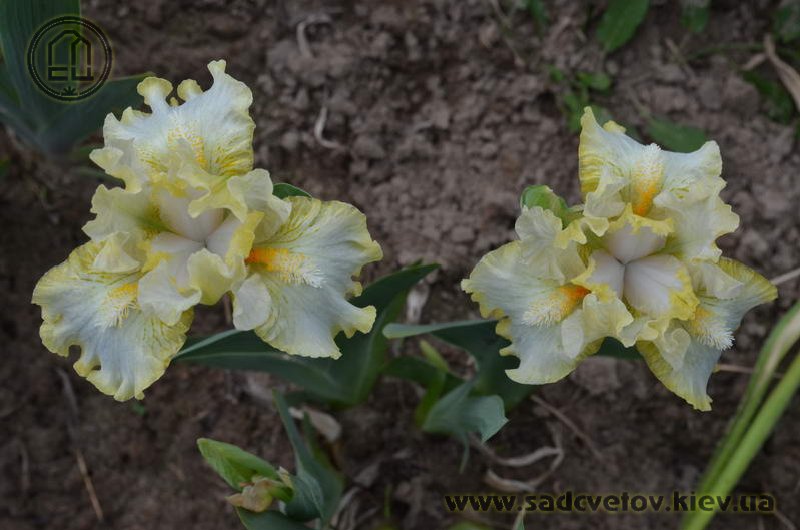 Добре гофрована жовто-біла пліката. Ст. - Білі з зеленувато-жовтим віялом прожилок які розгалужуються від основи. Серединка біла з зеленувато-жовтими кінчиками. Ф. - білий з зеленувато-жовтим візерунком плікати, малопомітним по краю і вираженим в плечах. Б. - від білого на кінці через жовтий в середині до оранжевого в горловині.