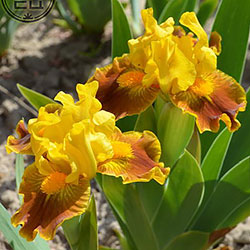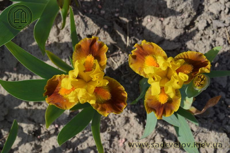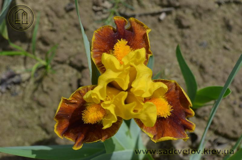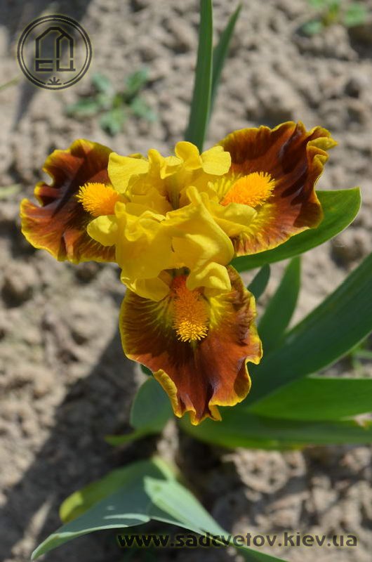 Яскрава гофрована квітка, жовті ст., ф. - гарячого червоно-коричневого кольору з тонкою жовтою облямівкою по краю, жовто-оранжеві б.