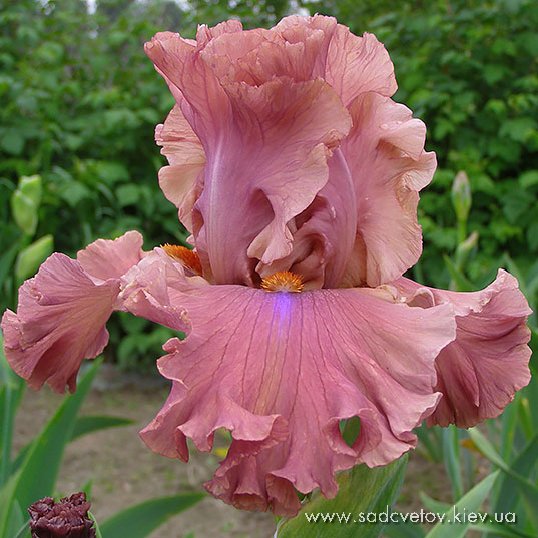 Гофрована і мереживна квітка. Ст. - бежеві блідо-рожеві з лавандовим рум'янцем в середніх прожилках, по бузковому фону фолів від плечей і на відстані навколо яскравих червоно-мандаринових борід розмите гало пурпурно-рожевого кольору, поруч з борідкою візерунок з рожевих прожилок
