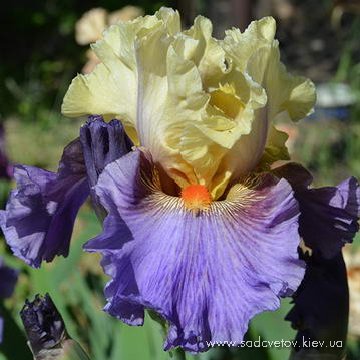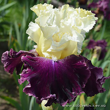 Гофрована і мереживна квітка, ст. вершково-білі з жовтим рум'янцем в середніх жилках, серединка кольору стандартів з пурпуровим пір'ям на кінчиках, ф. глибокого червоно-пурпурного кольору з висвітленням по краях до світло-пурпурного і невеликим радіальним візерунком біля борід кольору стандартів, невеликий синій вогник під б.