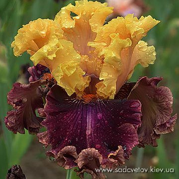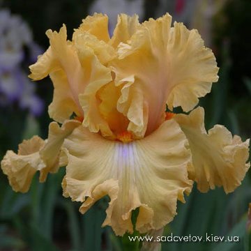 Супергофрований. Перехід від абрикосового до кольору манго зі світло-блакитним туманним "полум'ям" в центрі ф .. Бороди помаранчеві. Чудова форма.