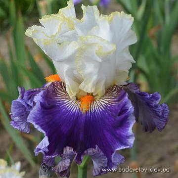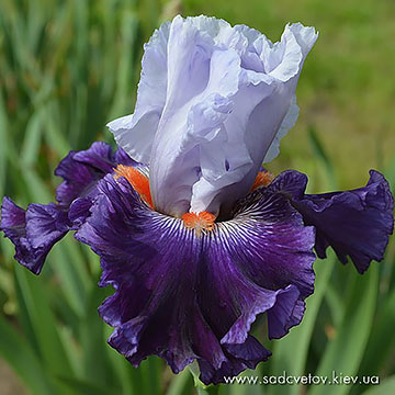 Добре гофрована квітка. Ст. - білі із золотистою облямівкою по краю. Ф. - насичені темно-ультрамаринові з виразним узором білих прожилок з боків від оранжевої б. і 1/6" світлою пурпурно-блакитною облямівкою по краю.