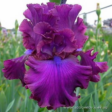 Злегка мереживна однотонна гофрована квітка. Помірно пурпурні ст., Темно-червоні ф. з висвітленням до кольору стандартів, малюнок білих переривчастих прожилок з боків від коричнево-оранжевої б.