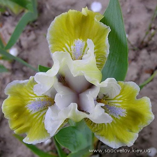 Гофрована квітка. Ст. - дуже світлий зеленувато-лавандовий з помітними темними прожилками, серединка як стандарти з зеленувато-жовтими включеннями, ф. - як стандарти з темною коричнево-бордовою плямою навколо бороди, яка розріджується на прожилки в жовтуватих плечах. Б. - яскравий жовтий з білим в основі, більш вираженим на кінчику.
