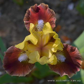 Гофрована квітка. С. - абрикосово-жовті. Серединка - зеленувато-жовта. Ф. - сливово-червоний під бородою який переходить в червоно-коричневий до гірчичних плечей з жовтим круговим висвітленням навколо бороди і тонкою каймою по краю. Б. - яскраві оранжеві.