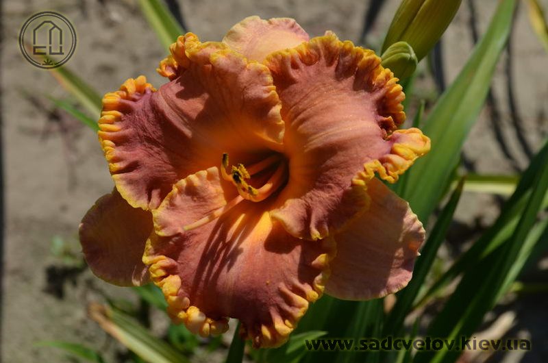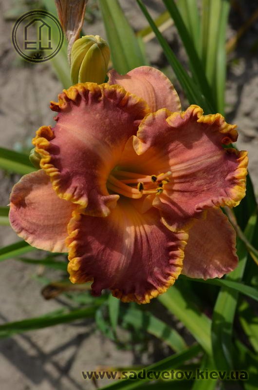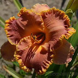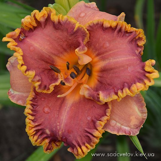 Червоно-теракотовий з помаранчевим горлом і жовто-помаранчевим щільним гофруванням по краю.
