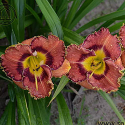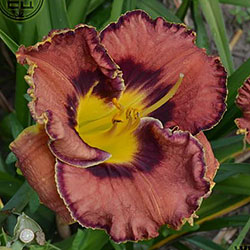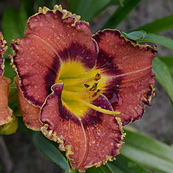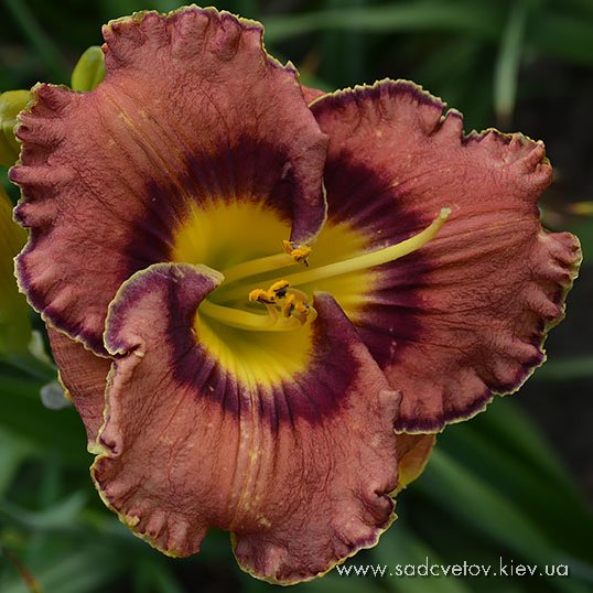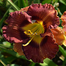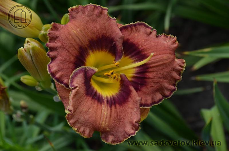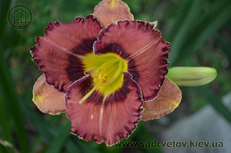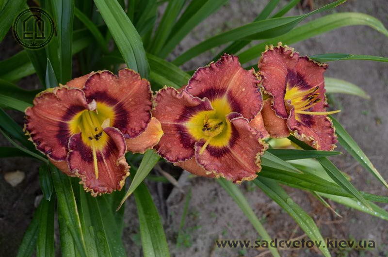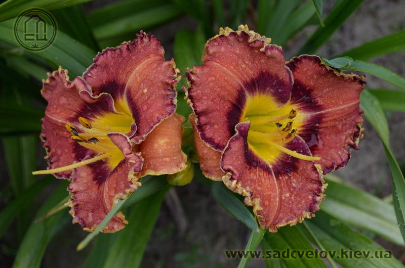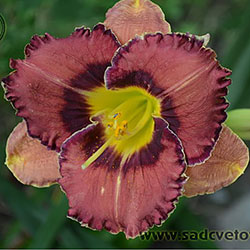 Круглий гофрований мандариново-червоний з контрастним темним бордовим оком і тонкою каймою цього ж кольору окантованою найтоншою жовтою ниткою по торця пелюстки, горло жовте з лимонно-зеленою серединкою.