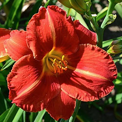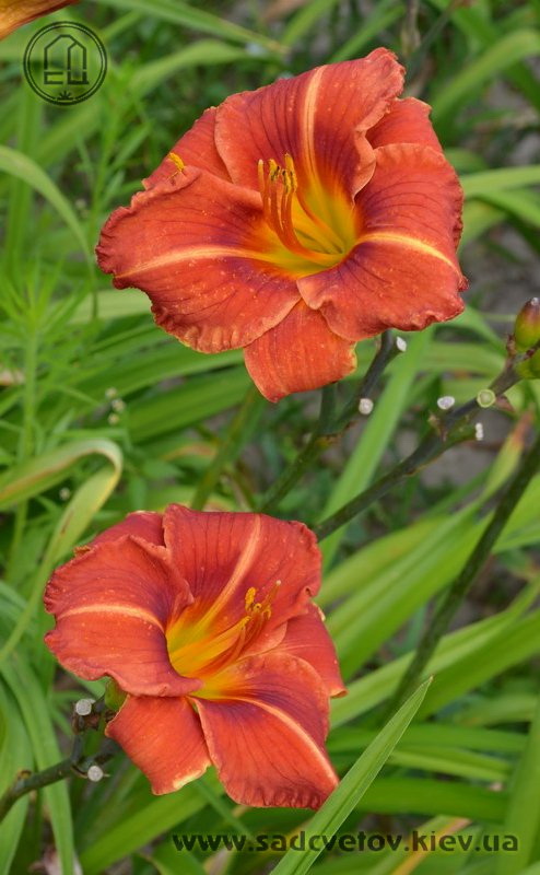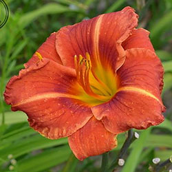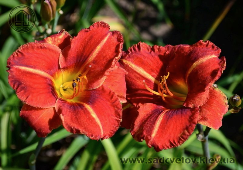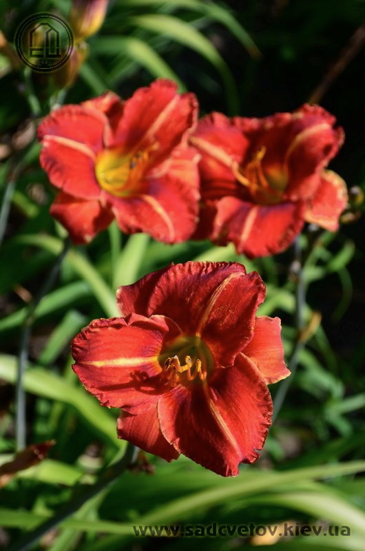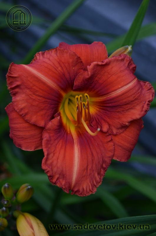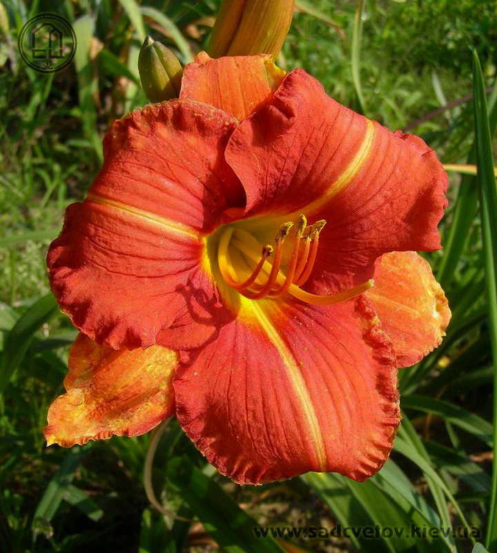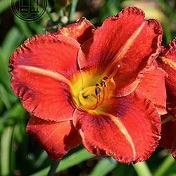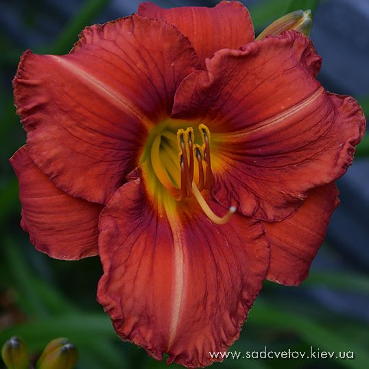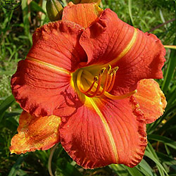 Червоний гофрований з лимонно-зеленим горлом, і радіальними жовтими смужками уздовж пелюсток.