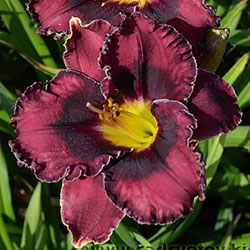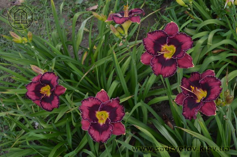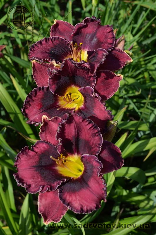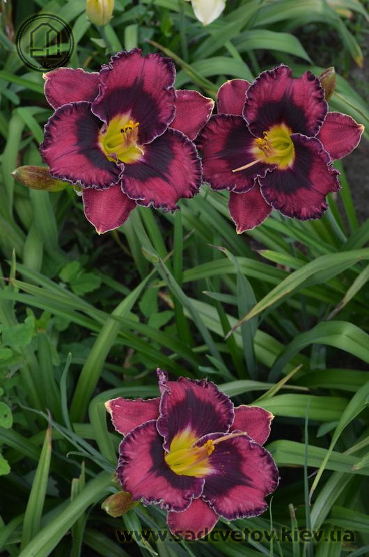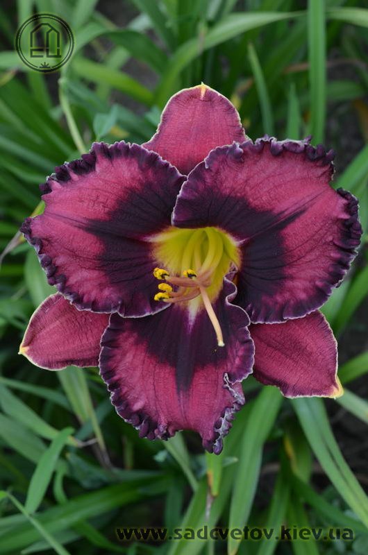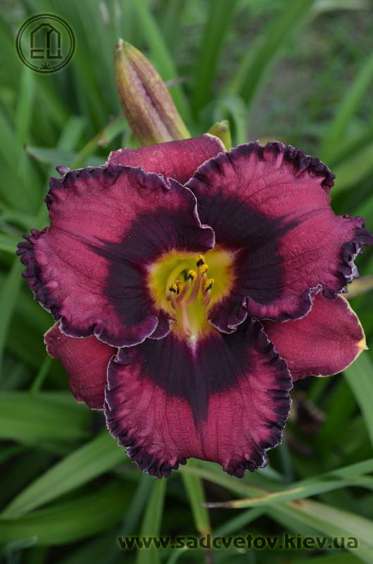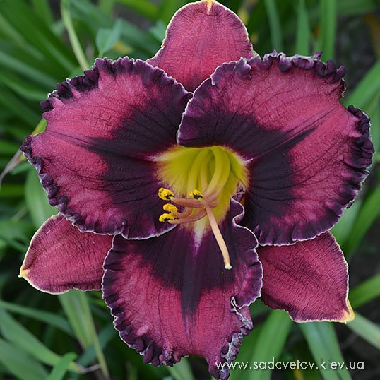 Прекрасно гофрований темно-малиновий з чорно-вишневим оком такою ж мереживною облямівкою окресленою тонкою білою ниткою по краю, горло жовто-зелене.