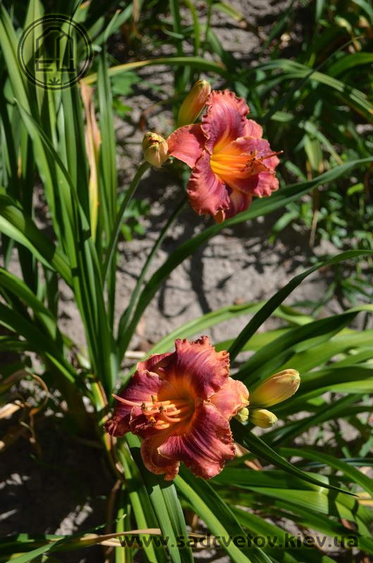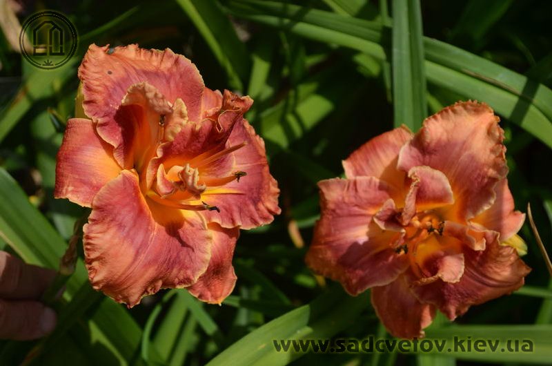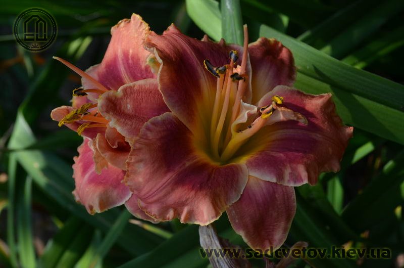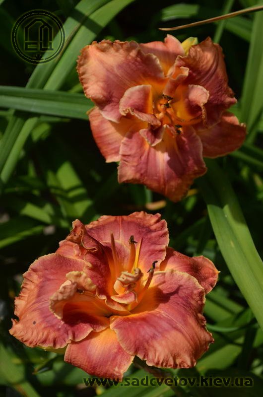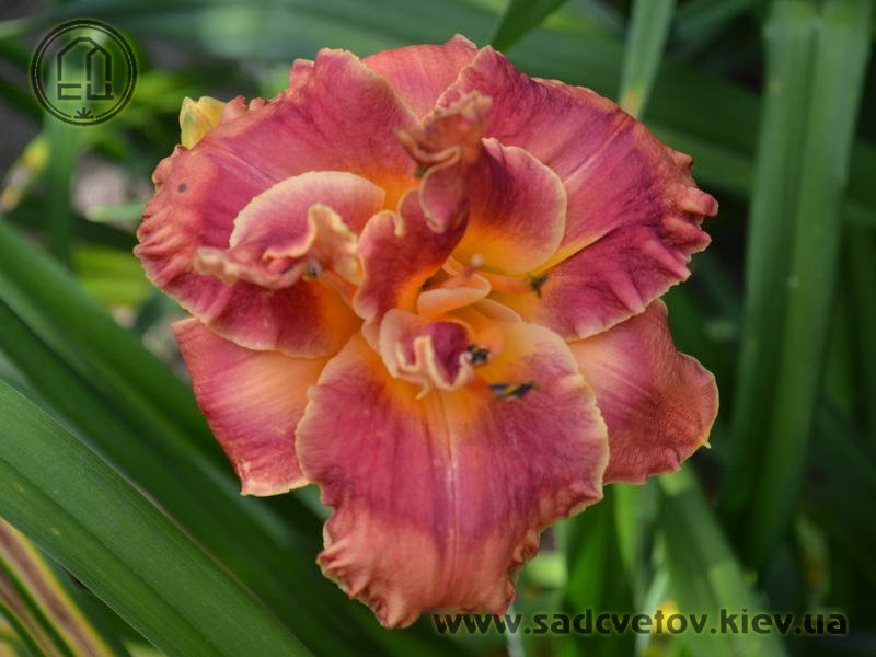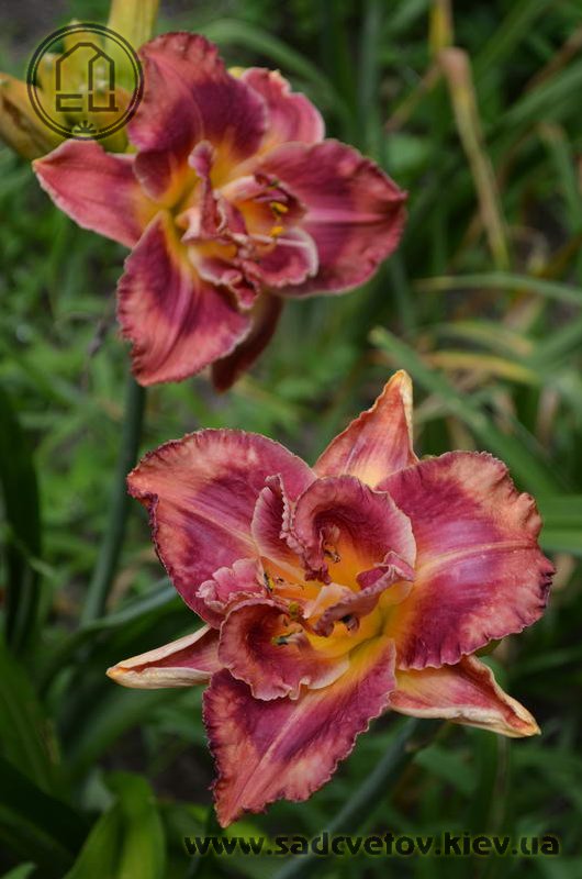 Гофрований кораловий з малиново-червоним оком і помаранчевим горлом. Махровість мінлива, залежить від сили куща.