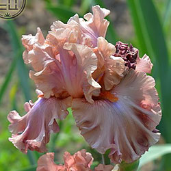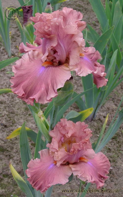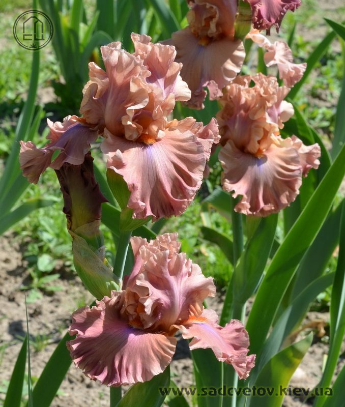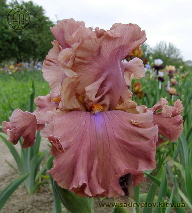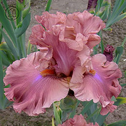 Великий супергофрований, злегка мереживний. Широкі малиново-теракотові квіти з маленьким фіолетовим полум'ям на ф. нижче яскравих мандаринових б..
