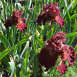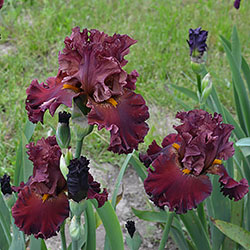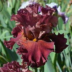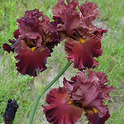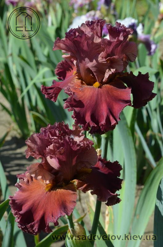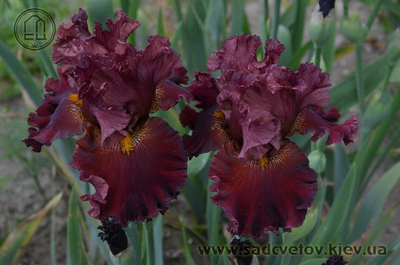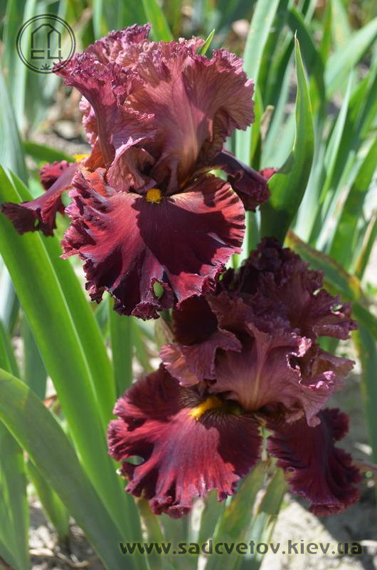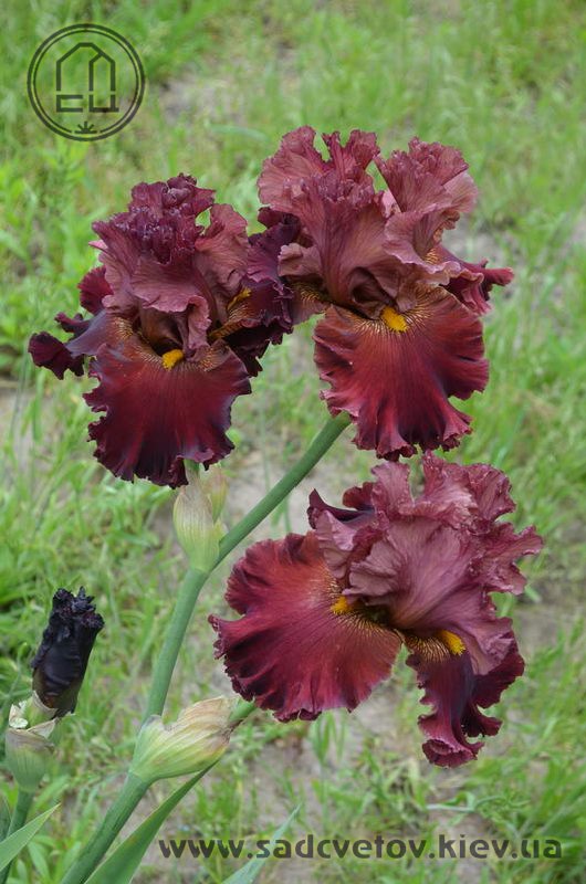 Прекрасно гофрована мереживна квітка. Ст. - зеленувато-червоно-оранжевий в основі з помірним пурпурно-червоним в середніх жилках і в верхівці стандартів, ф. - темний червоний з маленьким візерунком радіальних жовтих прожилок з боків помірно жовтої б.