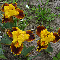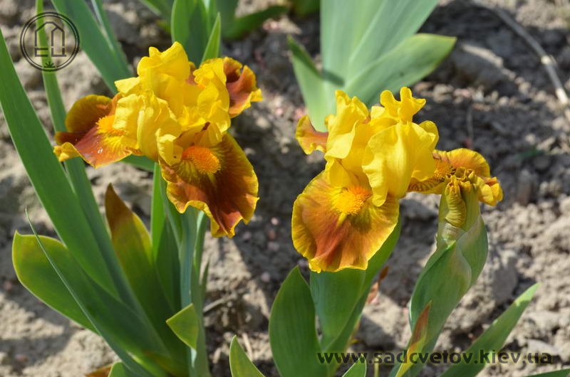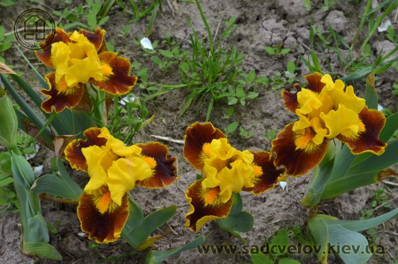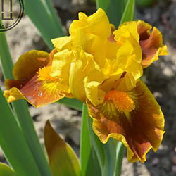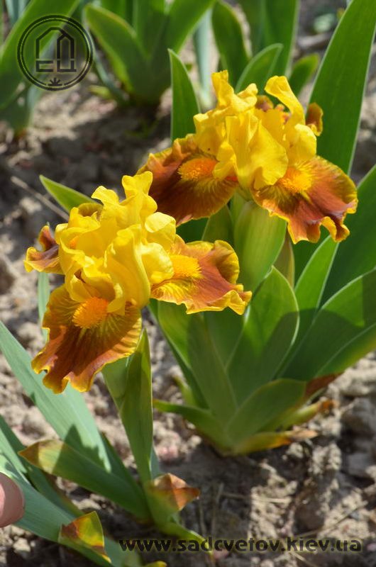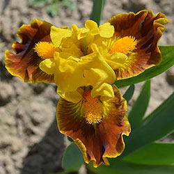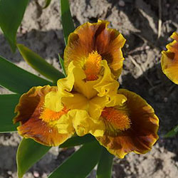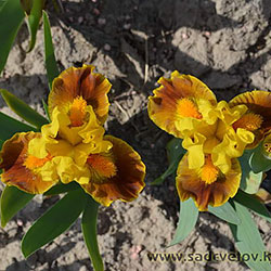 Яскрава гофрована квітка, жовті ст., ф. - гарячого червоно-коричневого кольору з тонкою жовтою облямівкою по краю, жовто-оранжеві б.