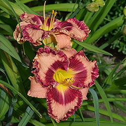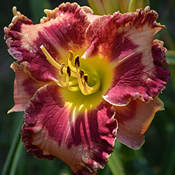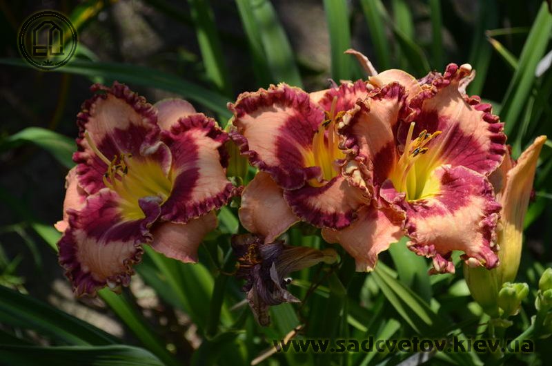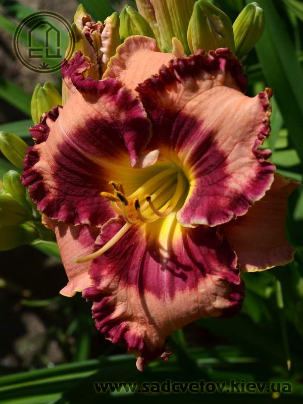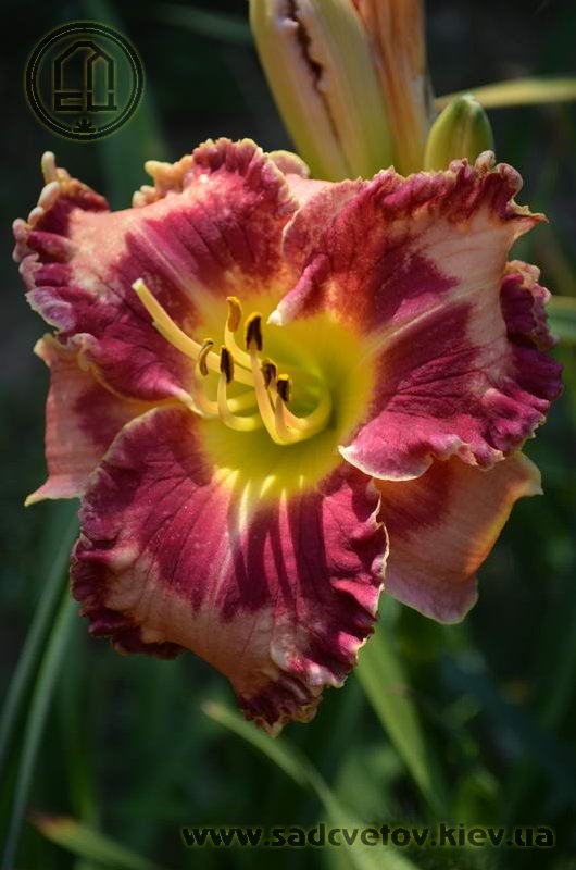 Гофрований світлий абрикосово-рожевий з яскравим насиченим карміново-червоним великим оком і такою ж широкою облямівкою по краю, лимонне горло.