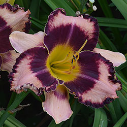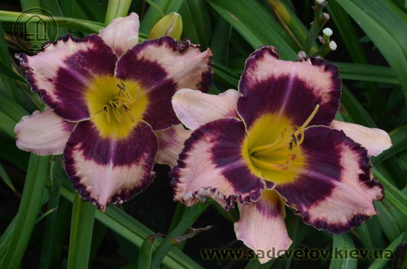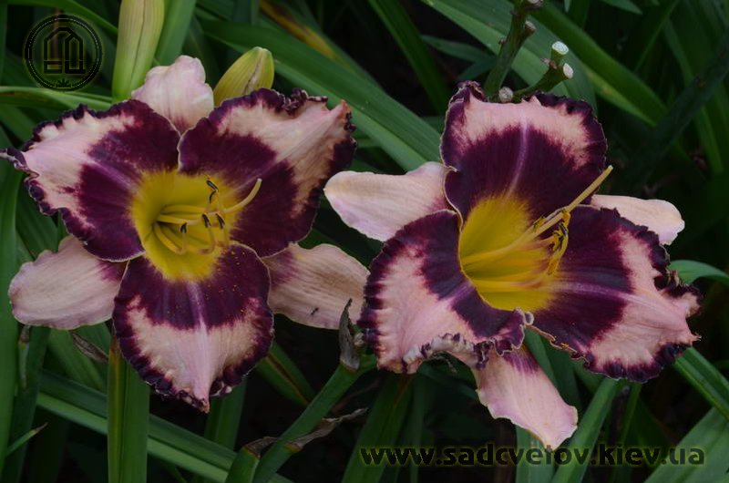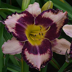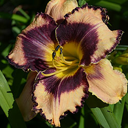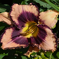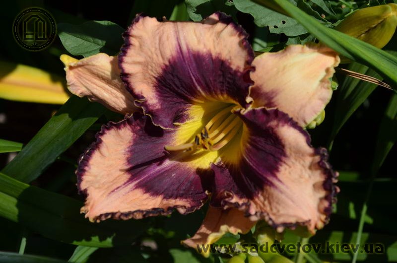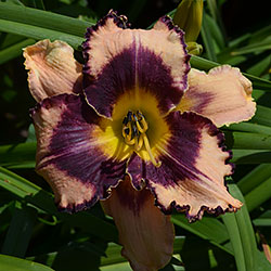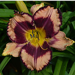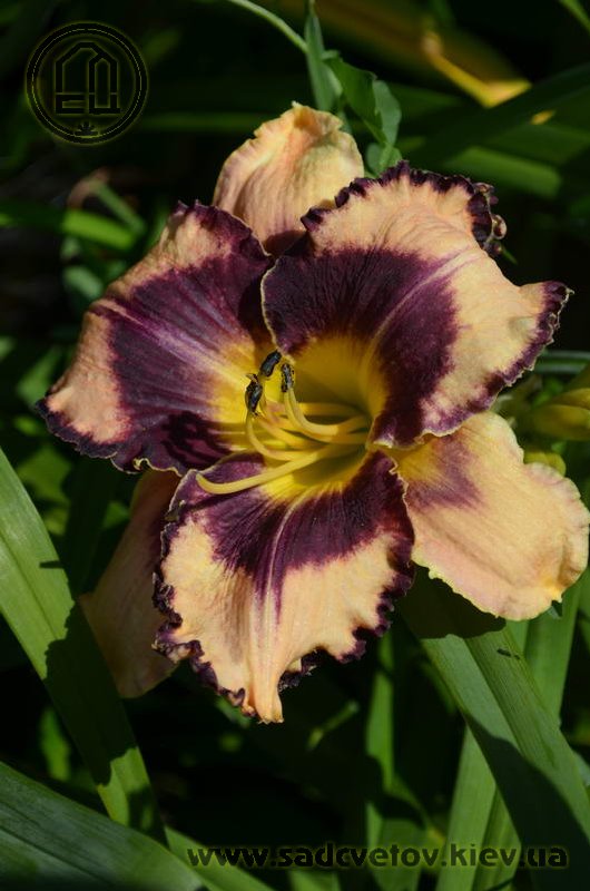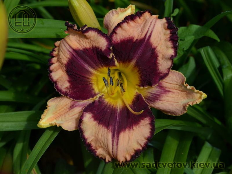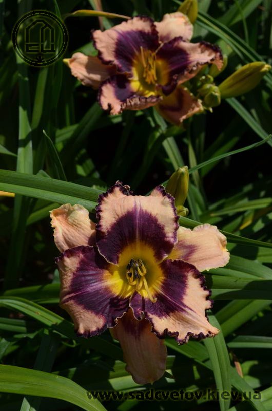 Світлоабрикосовий з великим темно-бордовим оком і такою ж широкою облямівкою, лимонне горло.