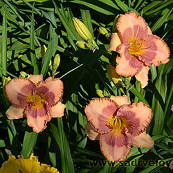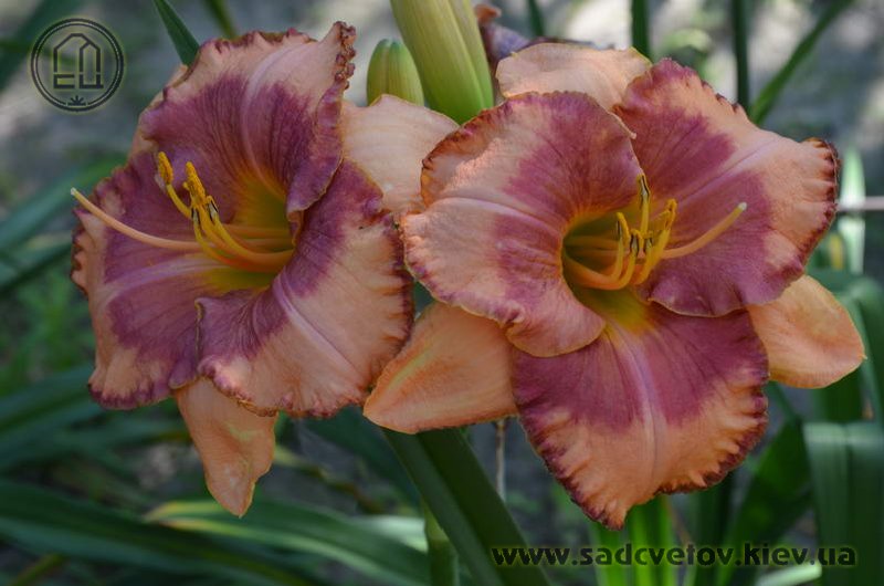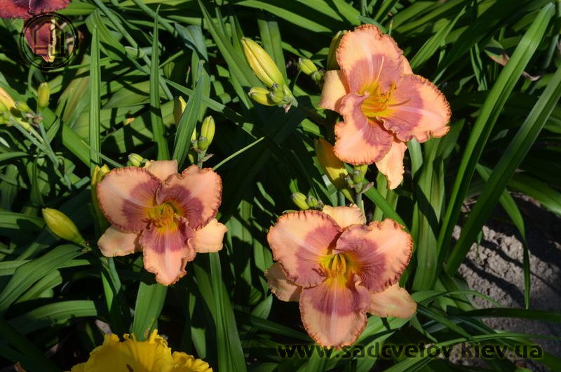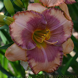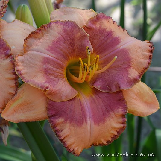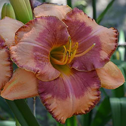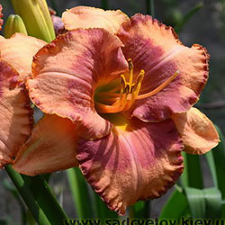 Блідий світло-помаранчевий з великим (більше половини пелюстки) рожево-теракотовим оком, такою ж темнішою гофрованою каймою по краю пелюстки, оранжево-зелене горло.