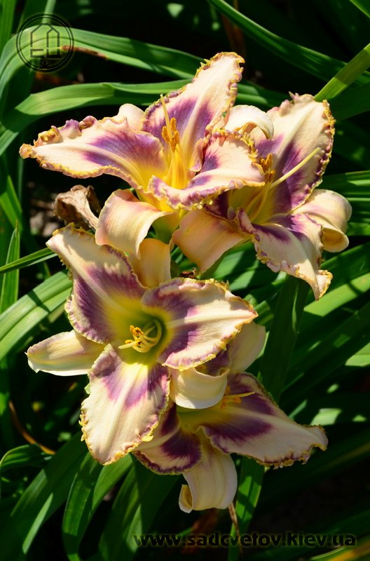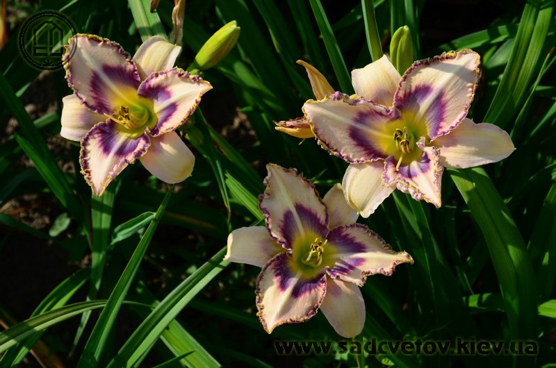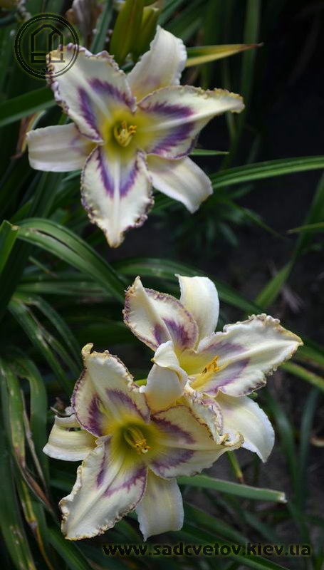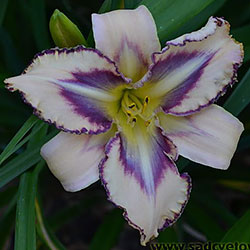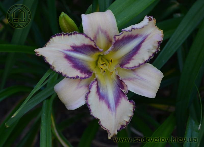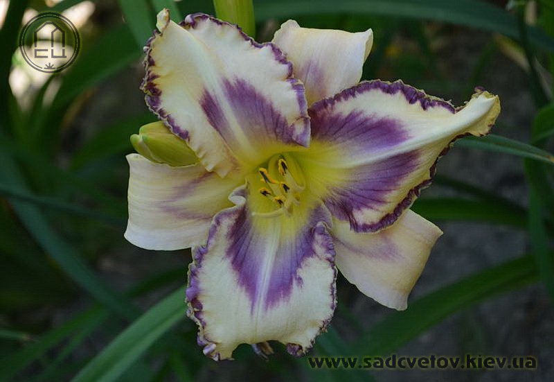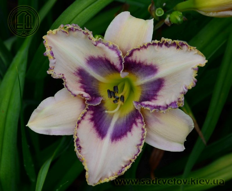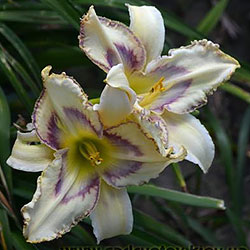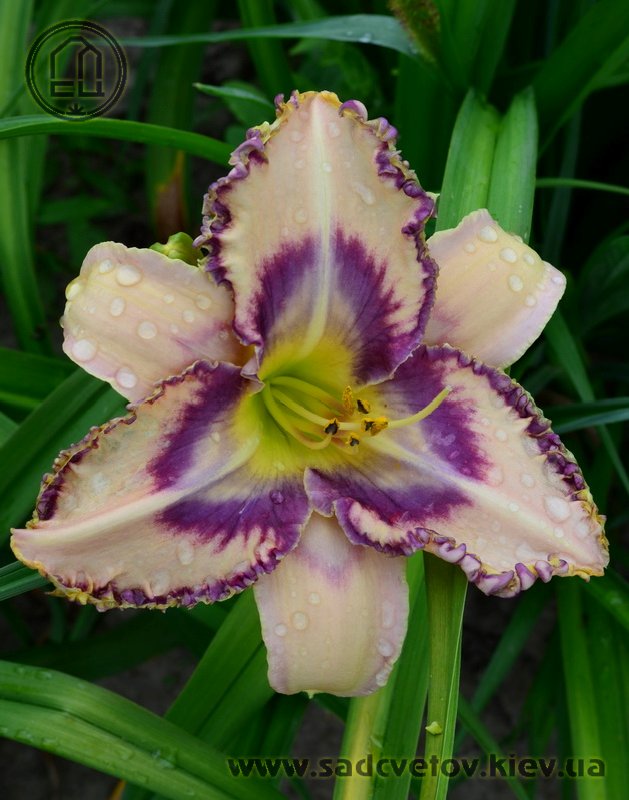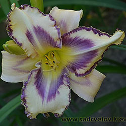 Кремово-бузковий з лавандовим оком і облямівкою, горло - жовто-зелене.