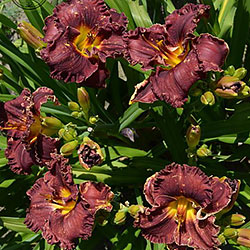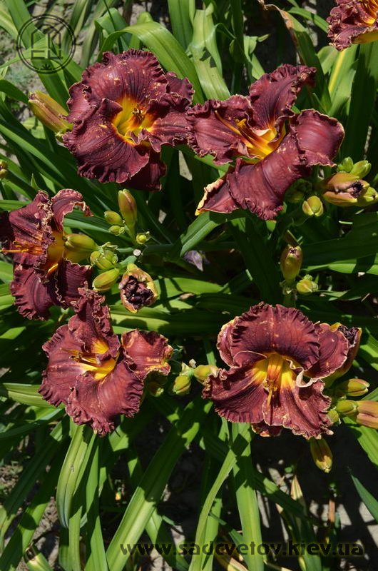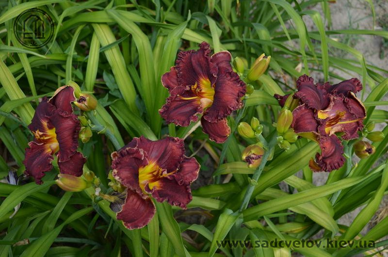 Добре гофрований темно-червоний з синім відтінком, жовте горло.