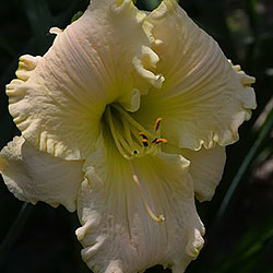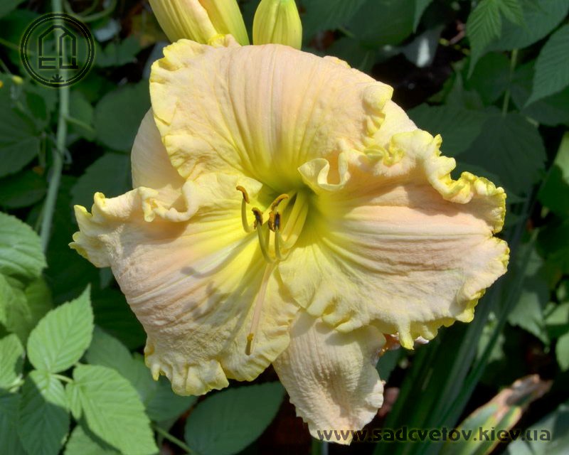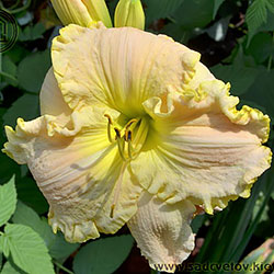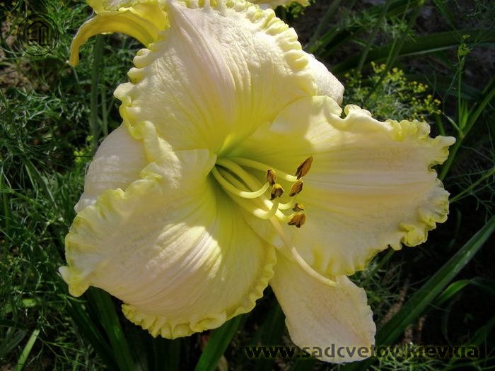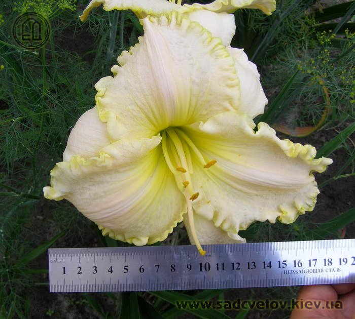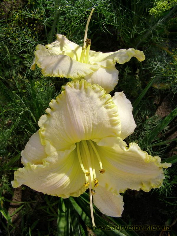Чарівний кремово білий з гофрованою золотистою облямівкою, дуже великий (до 18 см), щільна квітка.