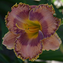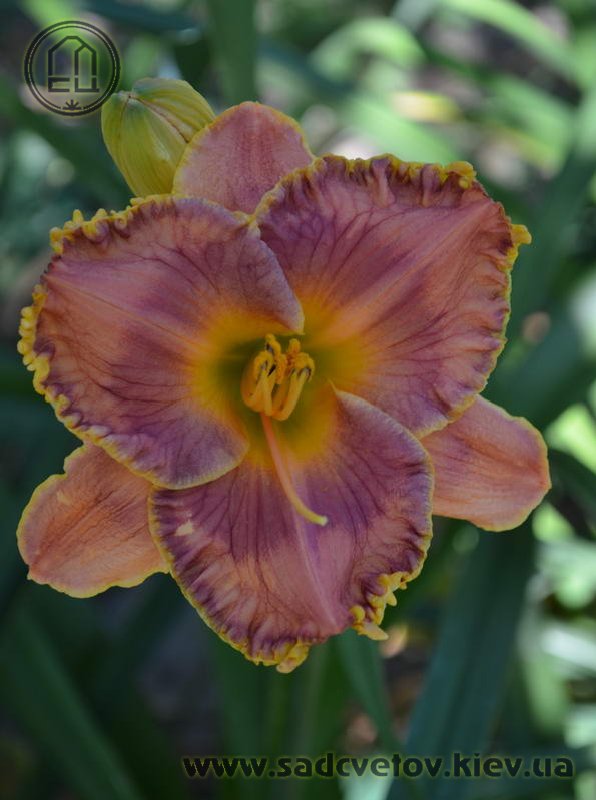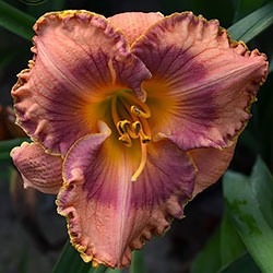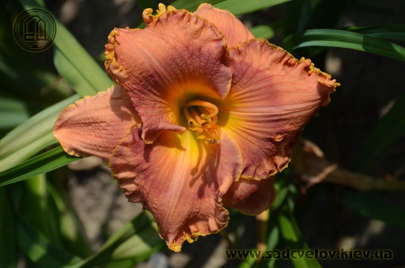 Гофрований кораловий рожевий з великим малиновим розмитим до середини акварельним оком, що перетікає в жовте горло. Золотиста з малиновим гофрована облямівка.