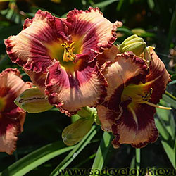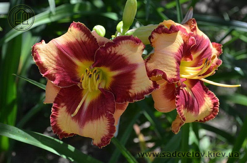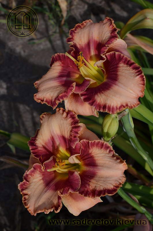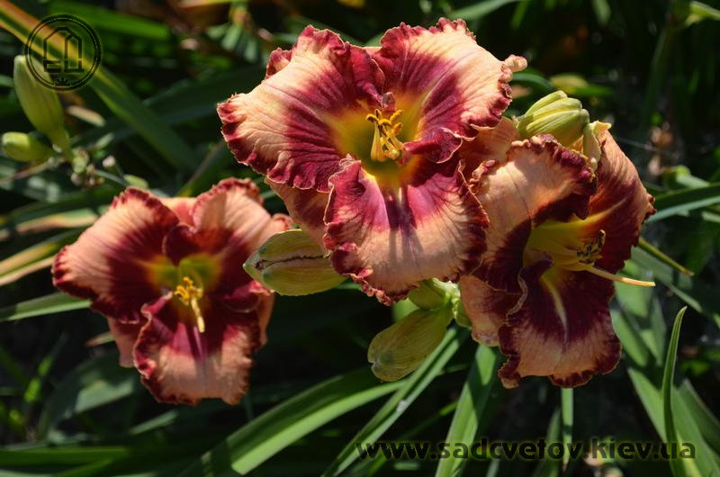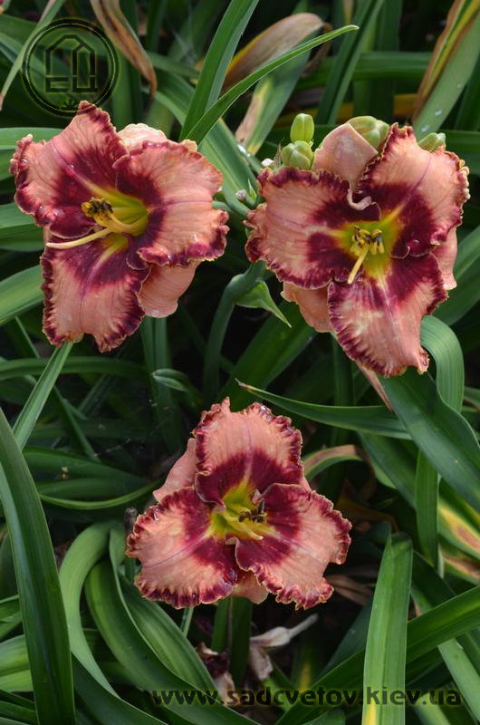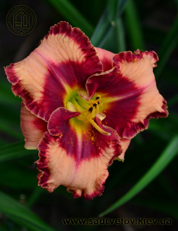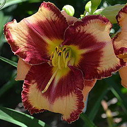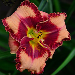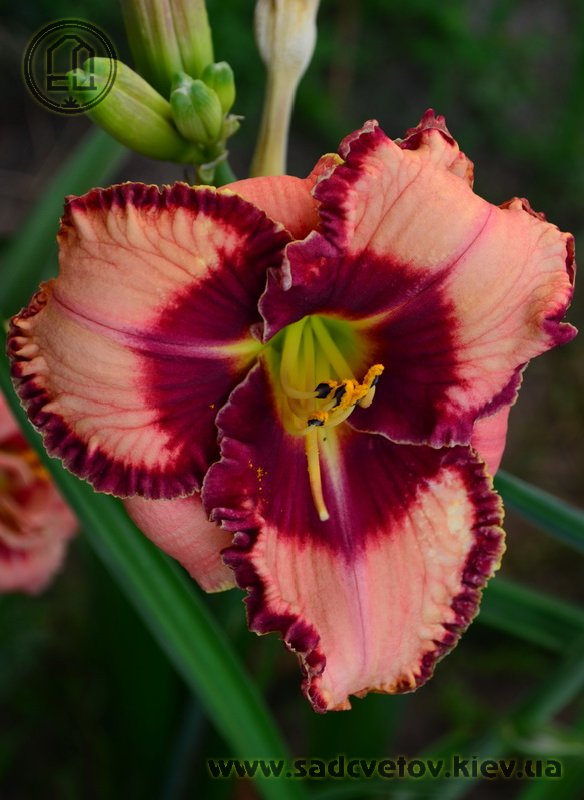 Круглий ніжний рожевий, яскраве вишнево червоне око навколо зеленого горлечка, така ж вишнево червона широка гофрована облямівка з вузьким золотистим краєм.