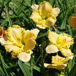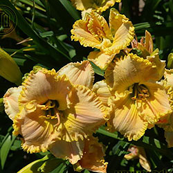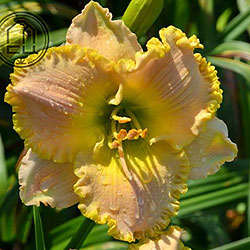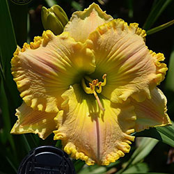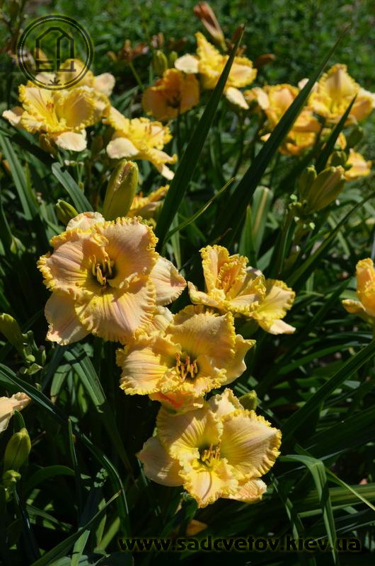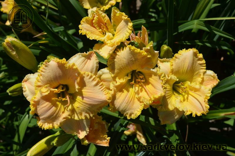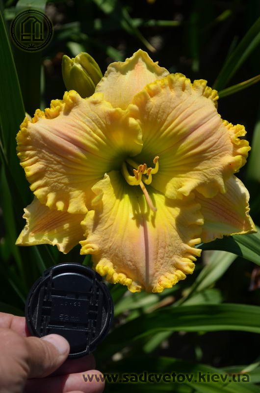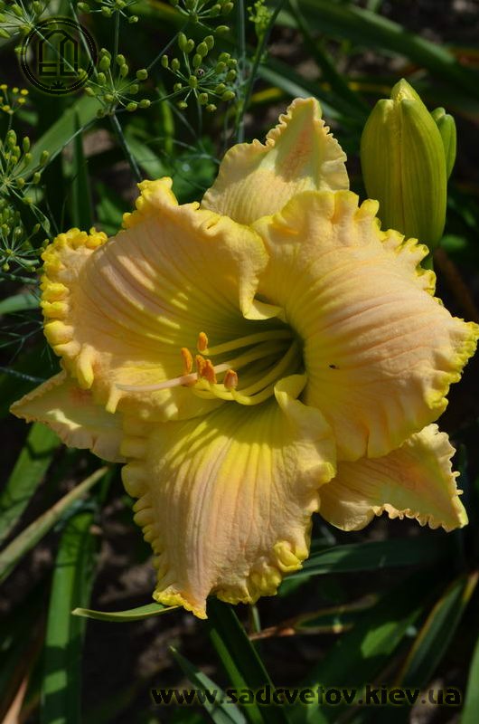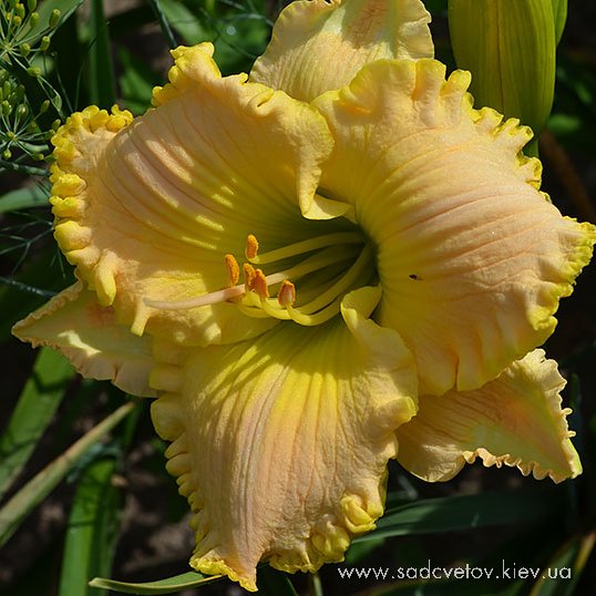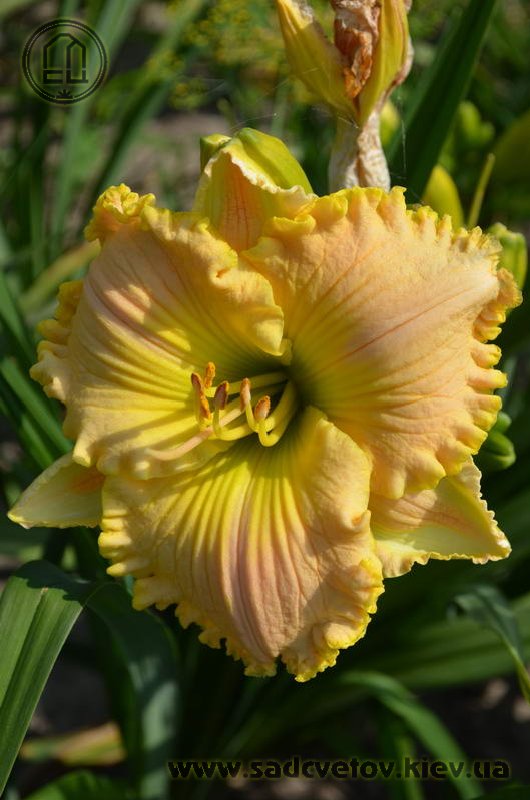Супергофрований молочно-персиковий з лимонним горлом і такою ж прекрасно складеною бахромою по краю.