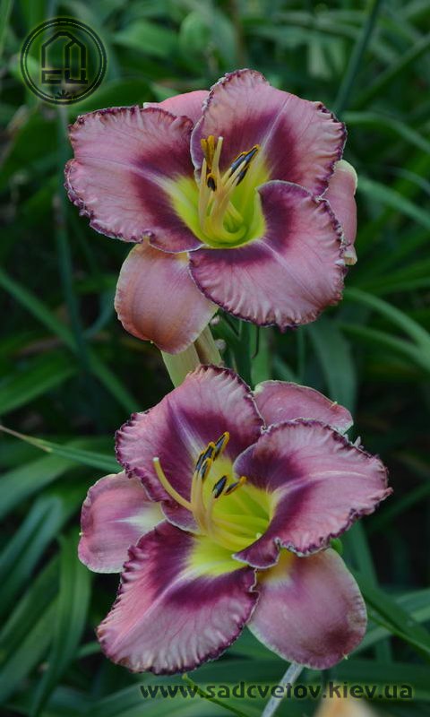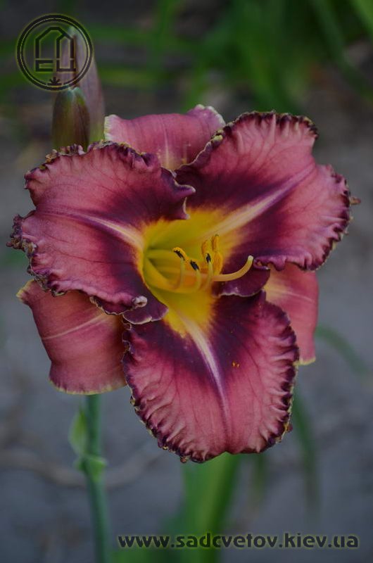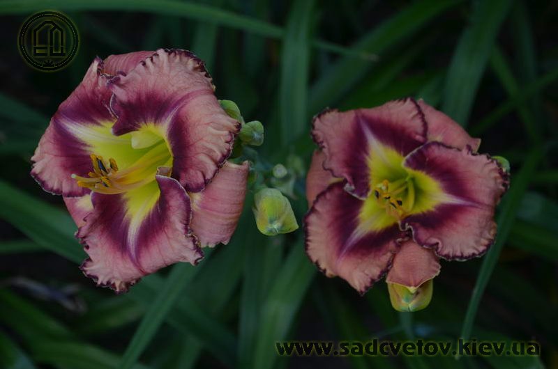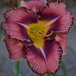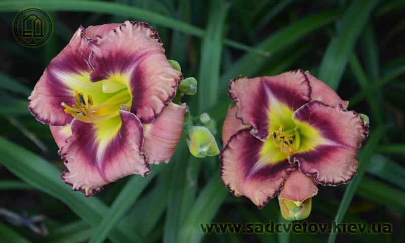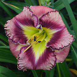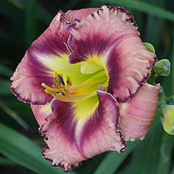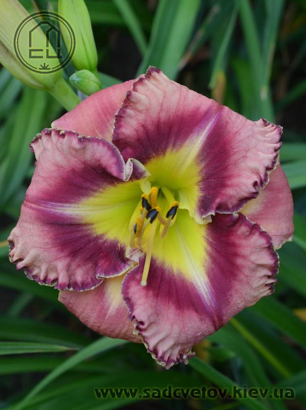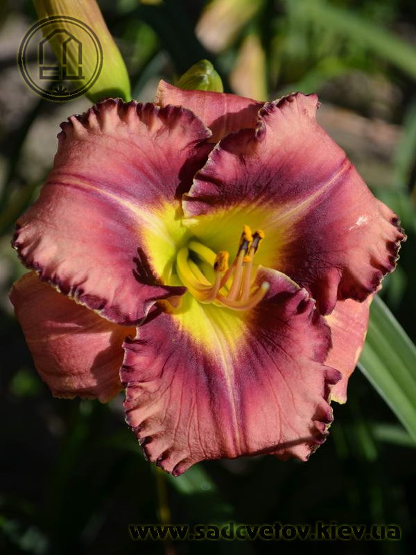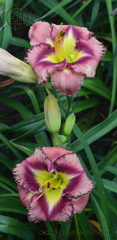 Гофрований рожевий з карміново-червоним оком і великим трикутним лимонним горлом, з тонкою облямівкою кольору ока і горла.