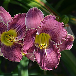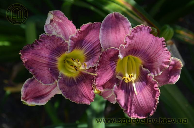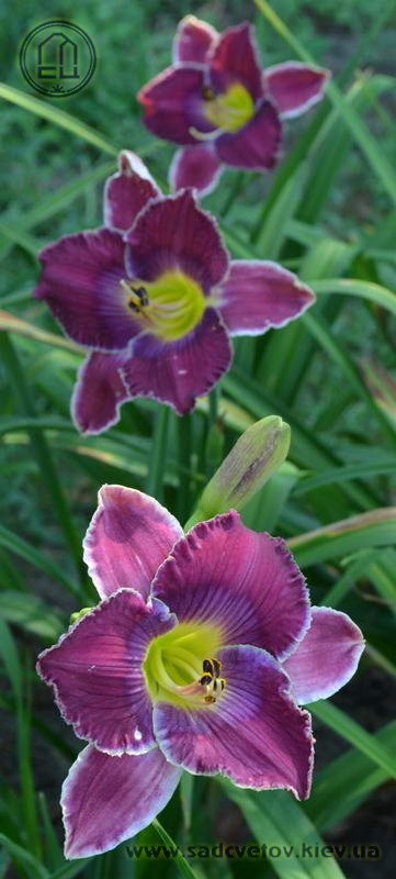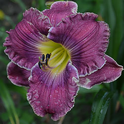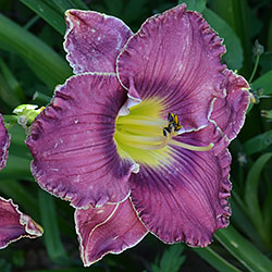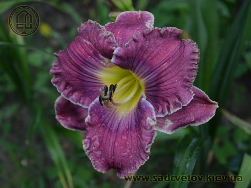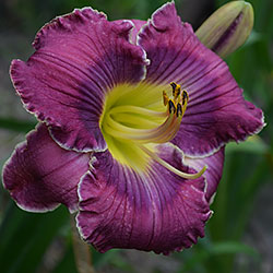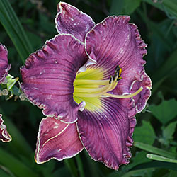 Гофрований яскравий лілово-пурпурний з фіолетовим оком і яскравим лимонним горлом, тонка світла облямівка по краю.