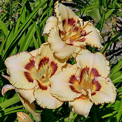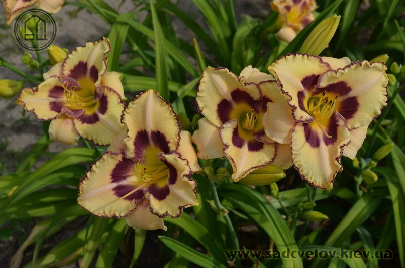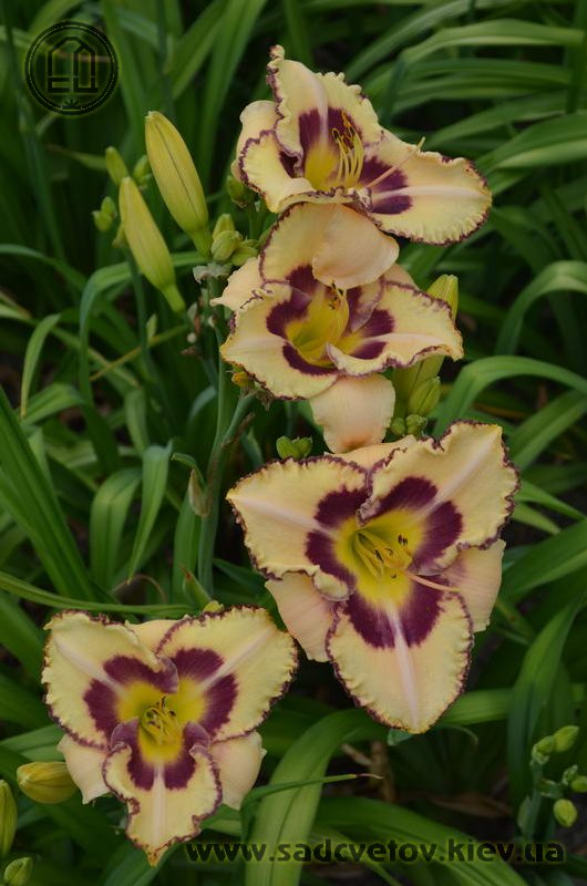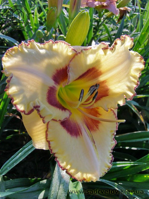 Молочно-кремовий з сливово-фіолетовим оком і такою ж тонкою каймою по гофрованому краю пелюстки.