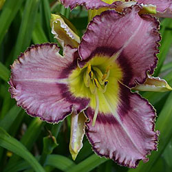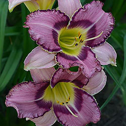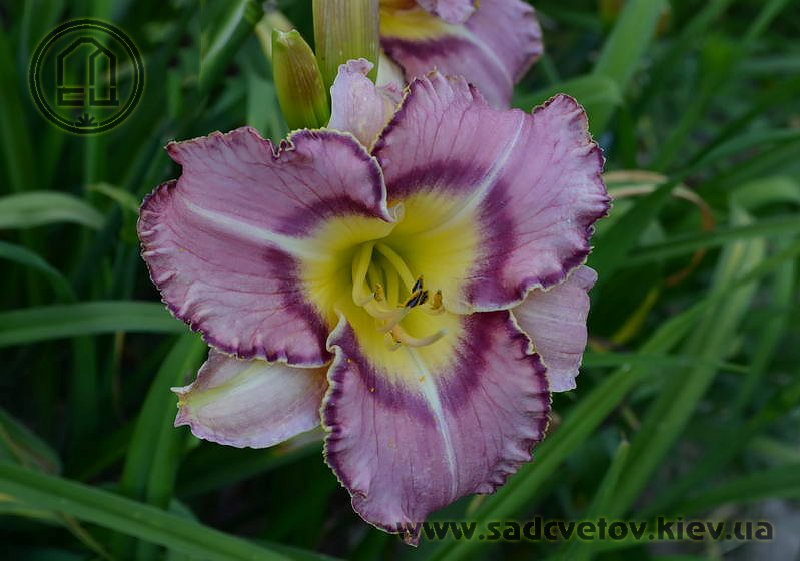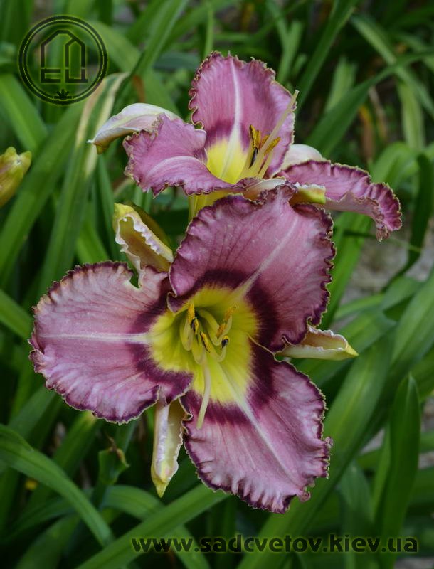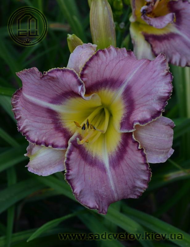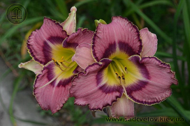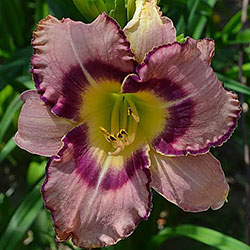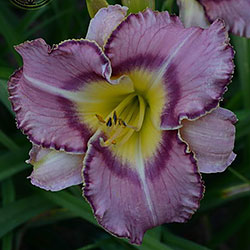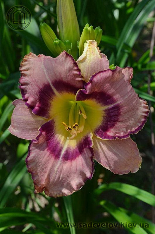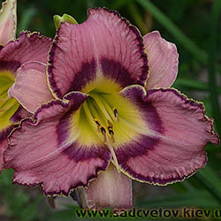 Великий злегка гофрований бузково-рожевий зі сливовим оком розсіченим радіальними світлими смугами уздовж пелюстки такою ж сливовою облямівкою і жовтим горлом.